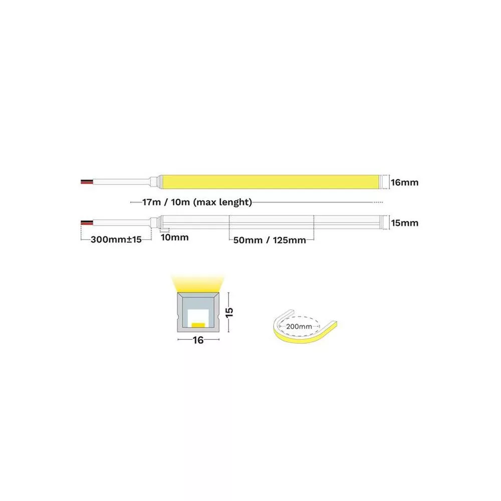 Fényereje 305 lm/m, színvisszaadási indexe (CRI) >72, élettartama akár 54.000 üzemóra, UV-álló, 12,5cm-ként vágható